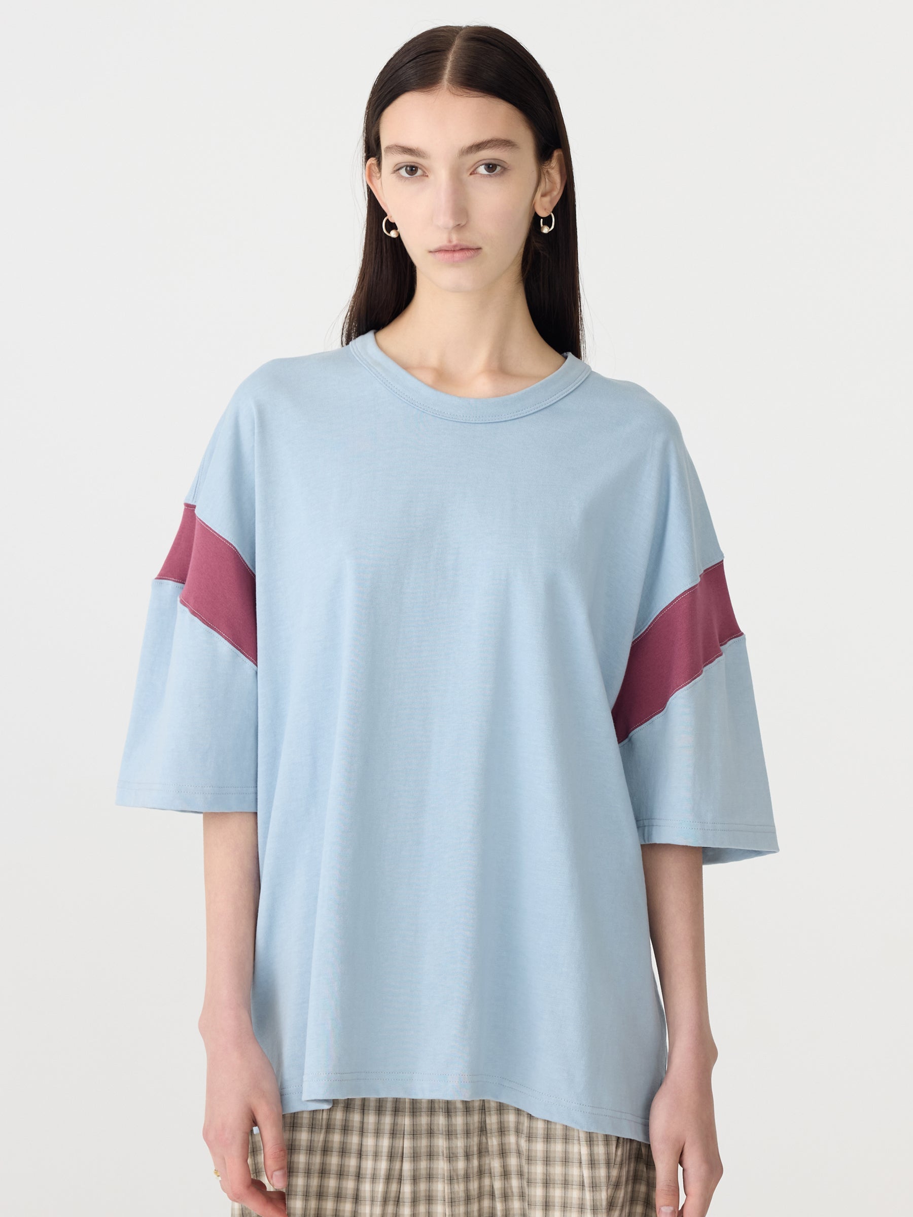 An elevated approach to everyday essentials, the Oversized Rib Detail T-Shirt blends comfort with contemporary detailing. Crafted in organic cotton jersey, it features a relaxed oversized fit with contrast burgundy rib panels against a pale blue base. A statement on its own or layered with denim and tailoring, this piece brings modern edge to a classic silhouette.
